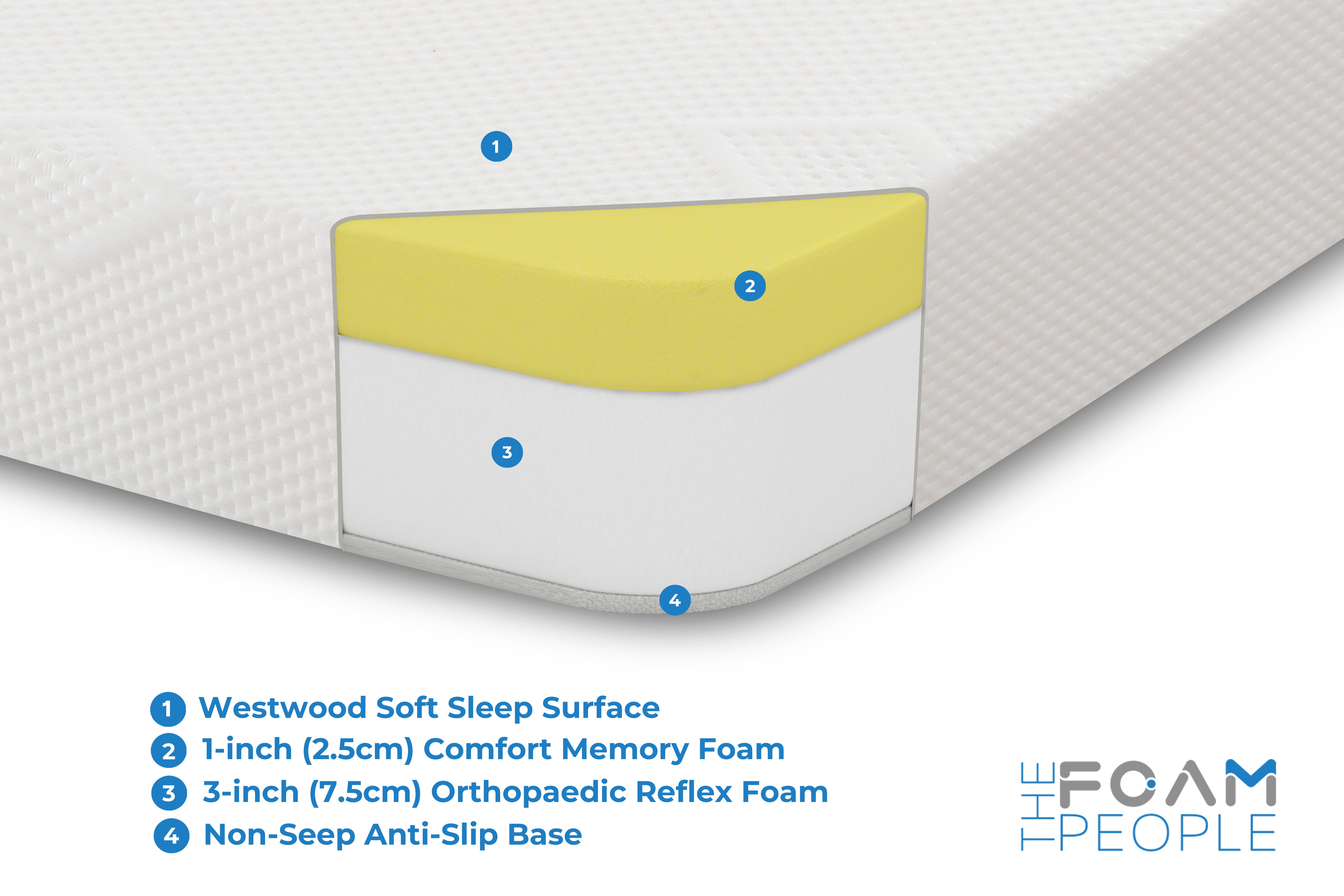 The Westwood Memory Foam and Firm Foam Mattress is crafted to provide an ideal combination of softness and support, making it perfect for sleepers who need balanced comfort. This mattress is 4-inch (10cm) deep and features a 1-inch (2.5cm) layer of softer Memory Foam, which gently contours to your body for pressure relief, and a 3-inch (7.5cm) layer of firmer Foam for a sturdy base that promotes proper spinal alignment.